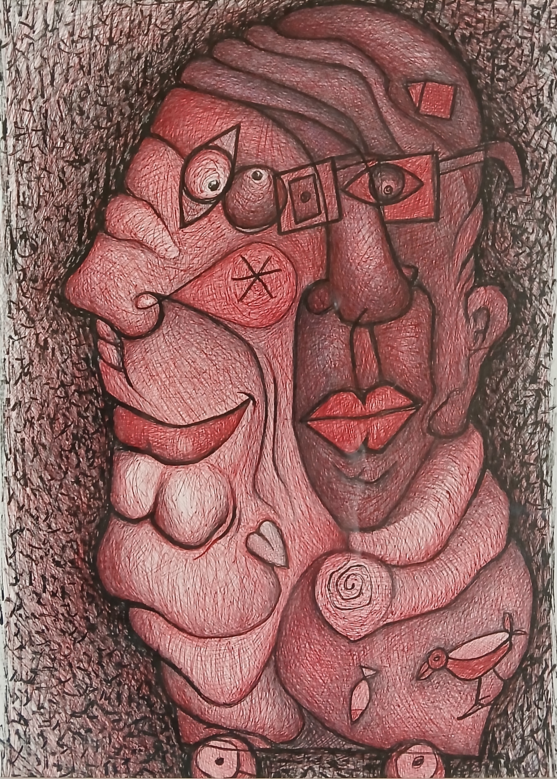 Bruno Antony, couple fusionnel, bic sur papier, 42x32cm, encadré 50x40cm, 2022