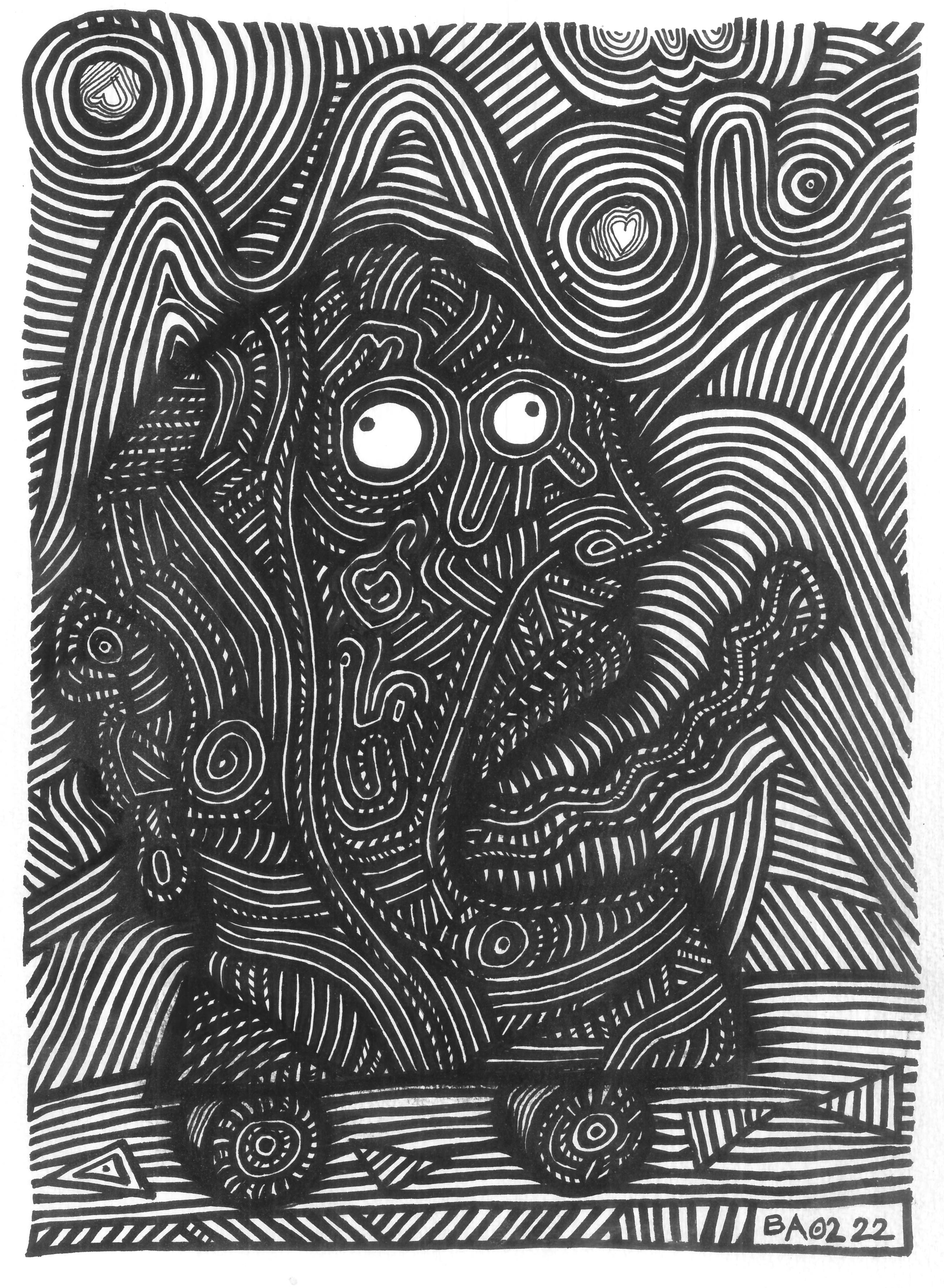Bruno Antony, le fou du volant, posca sur papier, 32x24cm, 2022-23.