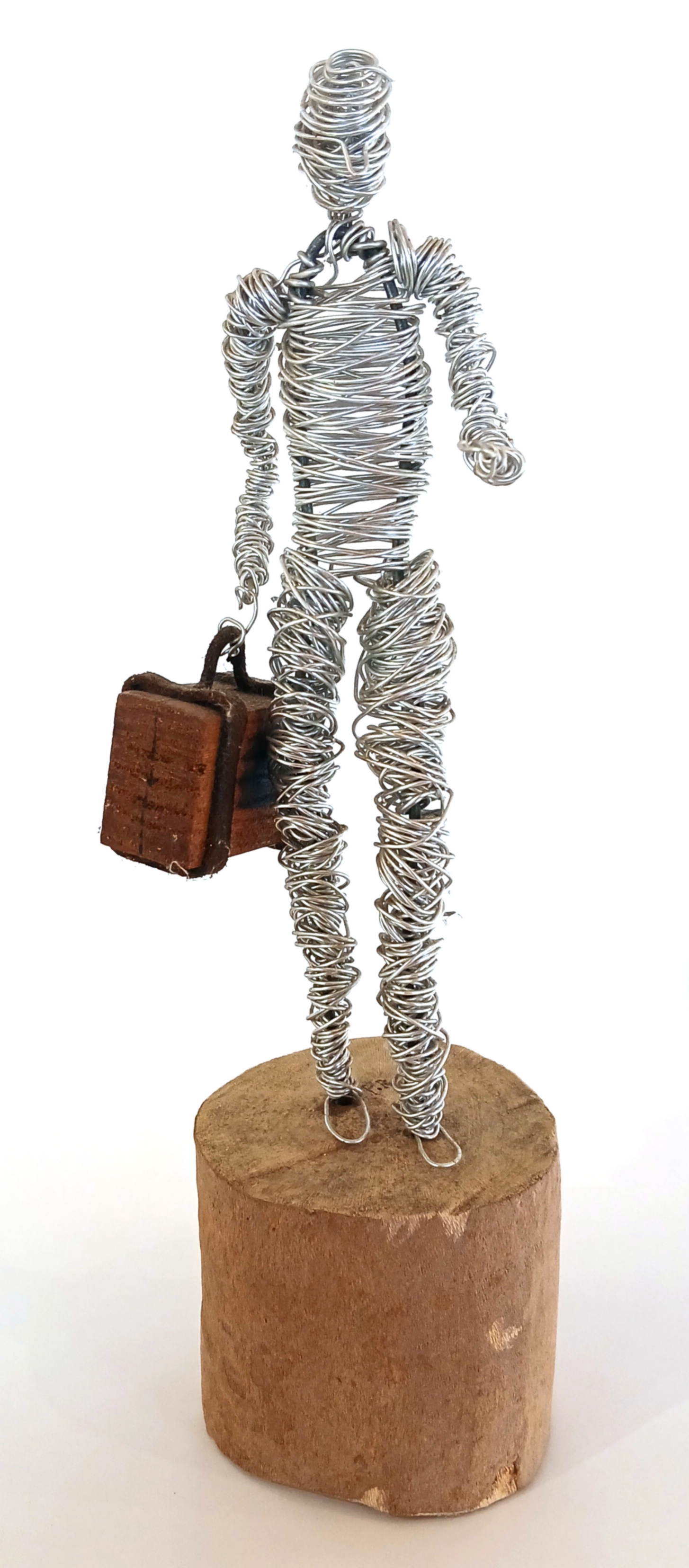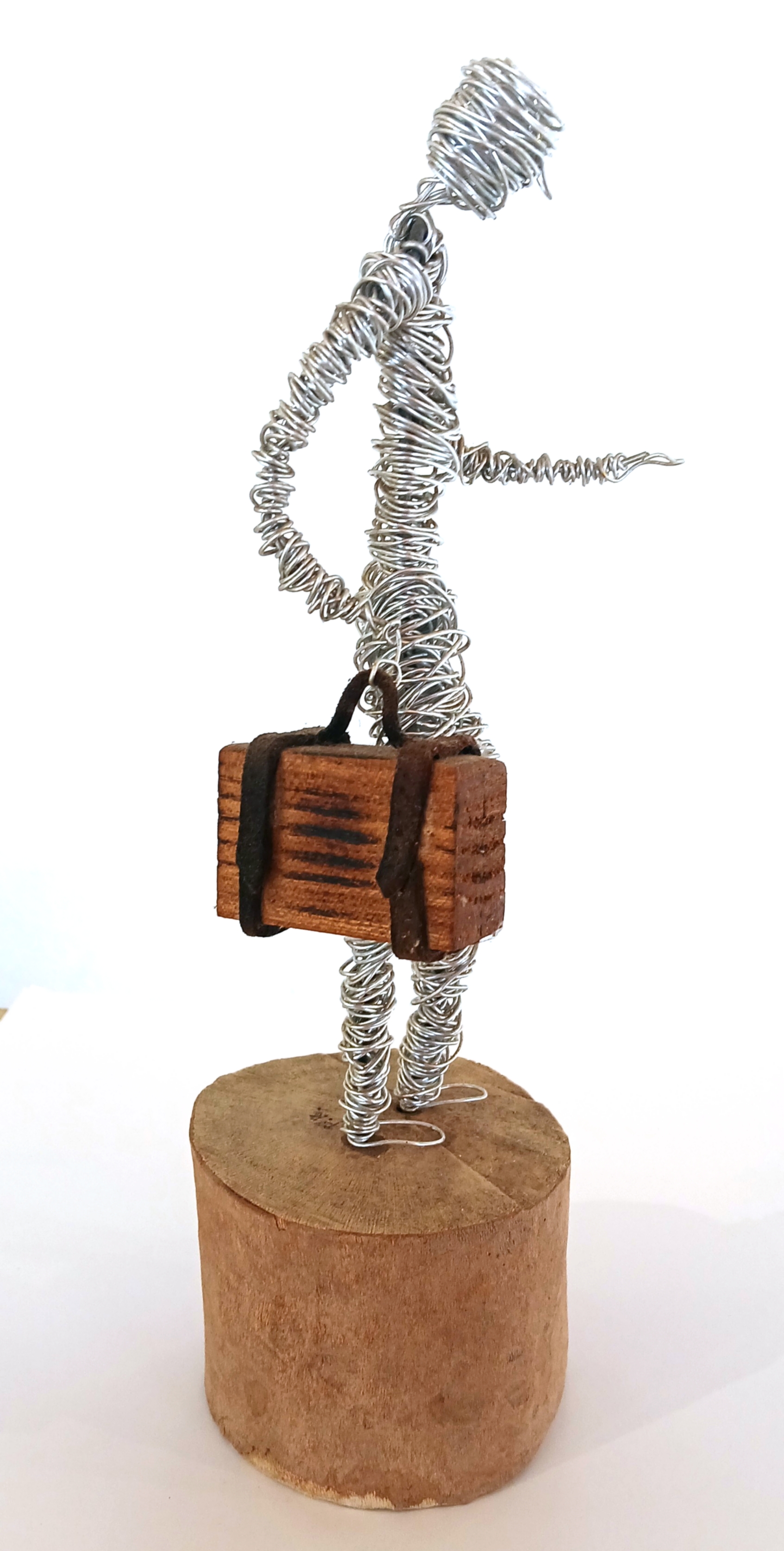 Paul Renault, le voyageur, fil d’aluminium et bois sur socle bois, 31cm, 2025.