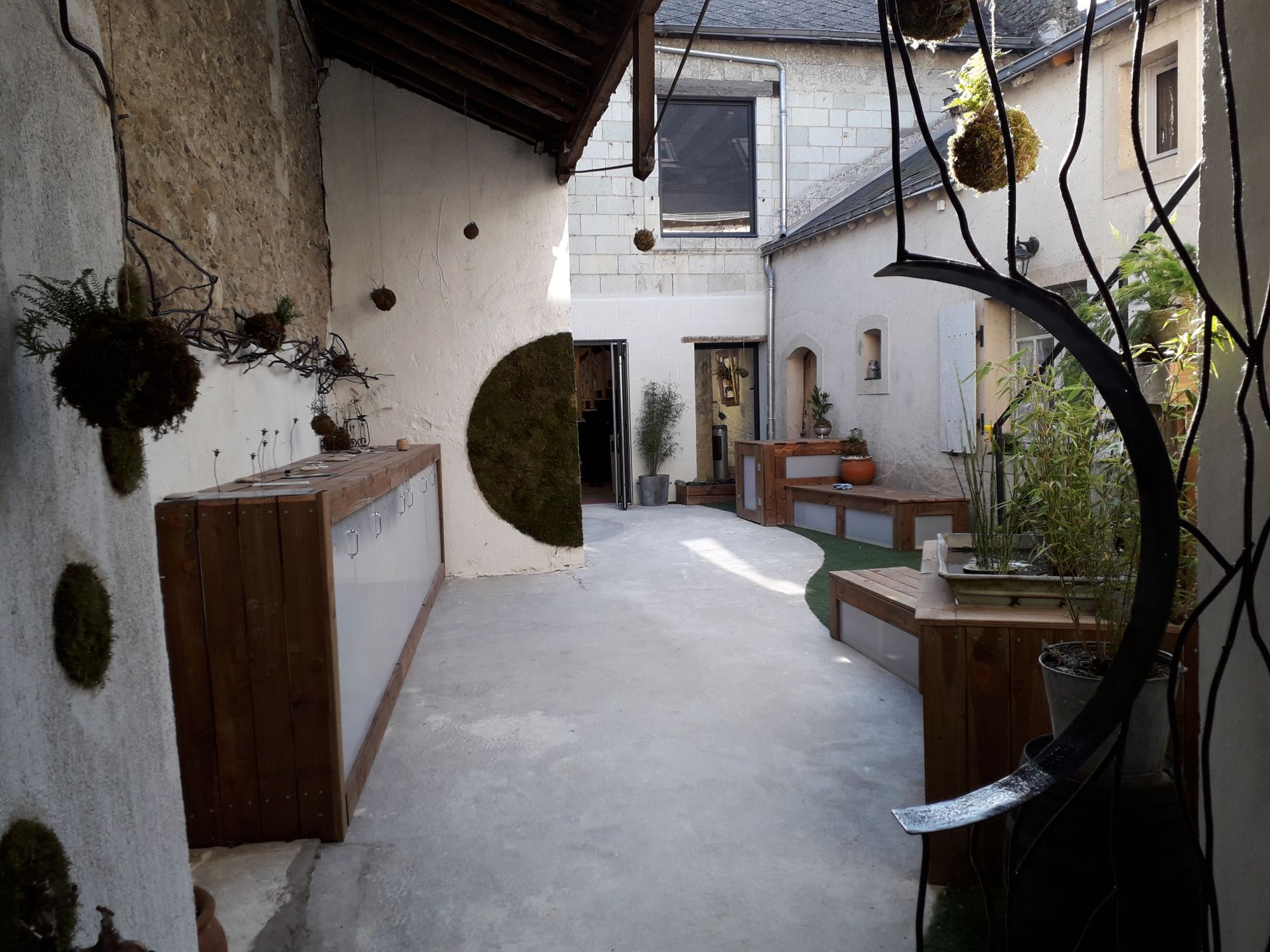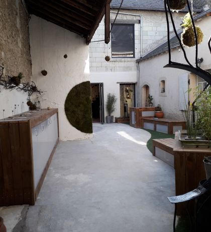 A l'extérieur, une cour à usage mixte d'environ 60m², aménagée par UBINAM, accueille des expositions de sculptures, les vernissages, des performances et des rencontres artistiques. Cet espace fait le lien entre la galerie, le salon de curiosités, une habitation et un gîte où la galerie accueille parfois des artistes.